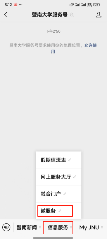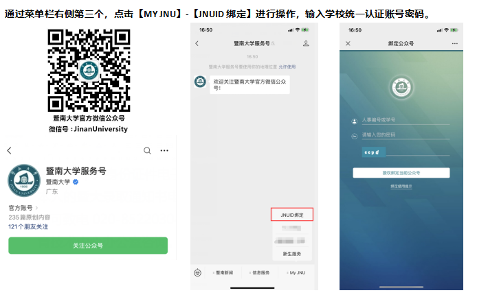 一、关注“暨南大学服务号(微信号JinanUniversity)”,点击微信公众号菜单栏“JNUID绑定”,按提示完成身份绑定。