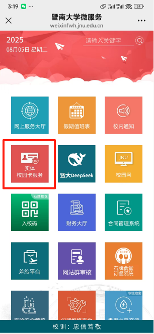 点击下方“信息服务”,选择“微服务”进入微服务页面,选择“实体校园卡服务”,进入“微信校园”界面。