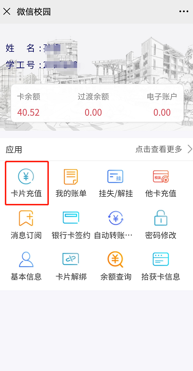 温馨提示:微信充值完成后,校园卡上不会立即显示已充值金额,师生只需到食堂等校内各POS消费机消费或刷卡领取补助,充值金额就会自动到账。如以上操作后还未到帐,请到校内各校园卡服务点处理。