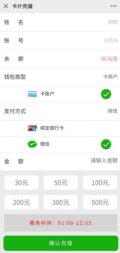 点击“卡片充值”,在跳转页面选择“微信”或者“绑定银行卡”支付方式和金额进行充值。注意支付方式选择“微信”时输入的是微信支付密码,选择“绑定银行卡”时输入的是校园卡密码。